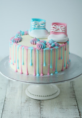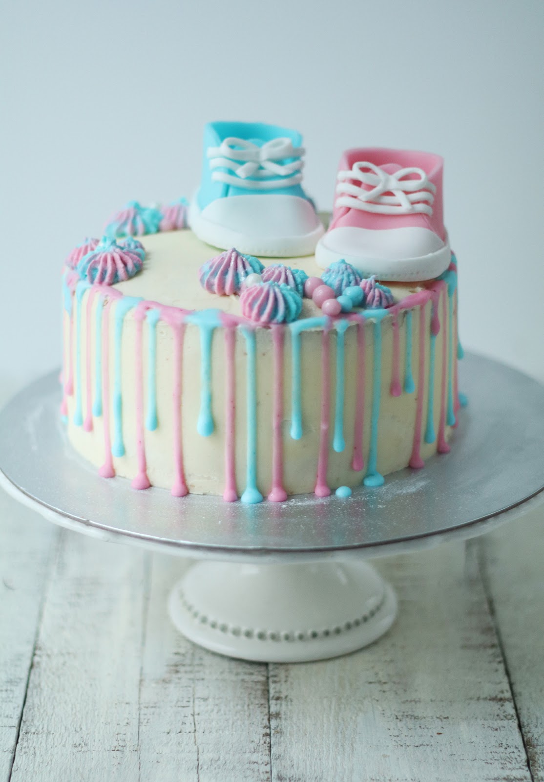 Pour la déco de ce Gender Cake, je me suis amusée ! J’ai fait un glaçage coulant rose et bleu et des décors en crème dans les mêmes tons et j’ai également réalisé des petits chaussons en pâte à sucre. Vous pouvez évidemment décorer votre gâteau de naissance comme bon vous semble mais si vous souhaitez également réaliser ces petits chaussons, voici le tuto duquel je me suis inspirée.