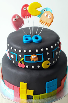 Bref, tout ça pour dire que, j’avais envie de vous partager mon premier gros gâteau en pâte à sucre. On a célébré les 50 ans de ma tante en lui organisant une petite surprise… J’ai donc eu envie de lui réaliser un gâteau d’anniversaire de folie qui la représente bien. Elle venait de recevoir sa nouvelle borne d’arcade et du coup je me suis dit « quoi de mieux qu’un gâteau d’anniversaire sur le thème de l’arcade ?! » On se retrouve donc avec du Tétris et du Pac-Man ! Et tout ça aux délicieuses saveurs de chocolat et de cacahuètes !